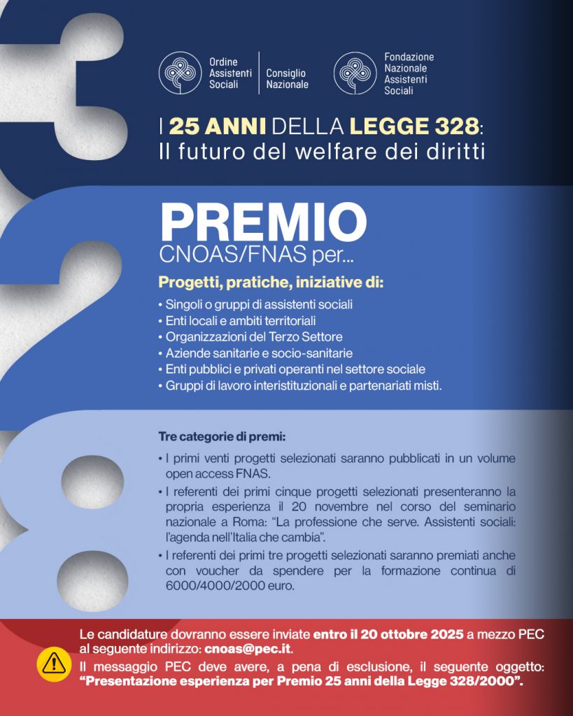 Definiamo la 328, la legge del 2000, come la norma fondamentale del welfare italiano. Una legge a cui noi assistenti sociali siamo legatissimi, una legge che ha cambiato la concezione del benessere, della salute delle persone e ha ribadito l’uguaglianza, in ogni angolo del nostro Paese, nei diritti al benessere, alla salute. In occasione delle celebrazioni del 25° anniversario di questo pilastro per la realizzazione del sistema integrato di interventi e servizi sociali, il Consiglio Nazionale dell’Ordine degli Assistenti Sociali (CNOAS) e la Fondazione nazionale Assistenti sociali (FNAS) istituiscono un premio nazionale volto a riconoscere, valorizzare e diffondere le esperienze più significative di attuazione e innovazione dei principi della legge.