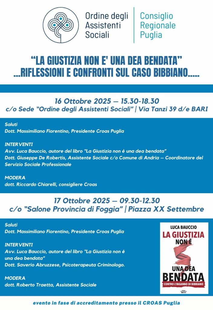Il CROAS Puglia e’ lieto di presentare l’evento formativo dal titolo “La giustizia non e’ una dea bendata”.