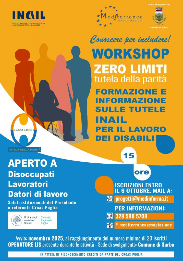 ID 105760 Mediterranea associazione – Corso ” Zero limiti, Tutela della parità; formazione e informazione per il reinserimento lavorativo dei disabili”, previste 4 giornate formative presso Comune di Surbo, n°10 crediti formativi e  n° 5 crediti deontologici