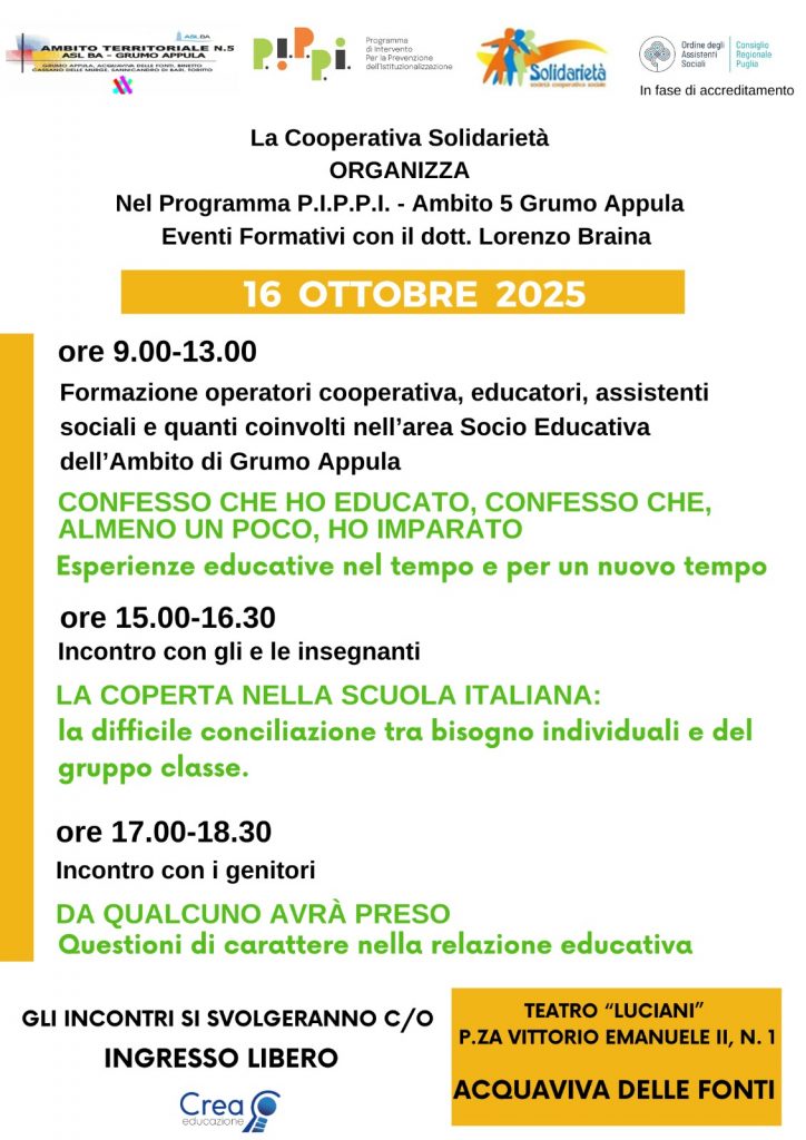 ID 105955 Solidarietà Soc. Coop – Convegno “Confesso che ho educato, confesso che, almeno un poco, ho imparato- Esperienze educative nel tempo e per un nuovo tempo” 16 ottobre Acquaviva delle Fonti,  n° 3 crediti formativi e n°1 credito deontologico