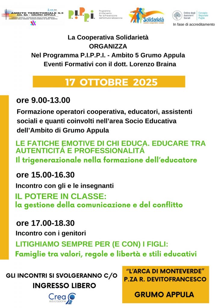 ID 105956 Solidarietà Soc. Coop – Convegno “Le fatiche emotive di chi educa. Educare tra autenticità e professionalità. Il trigenerazionale nella formazione dell’educatore”, 17 ottobre Grumo Appula, n° 3 crediti formativi e n°1 credito deontologico