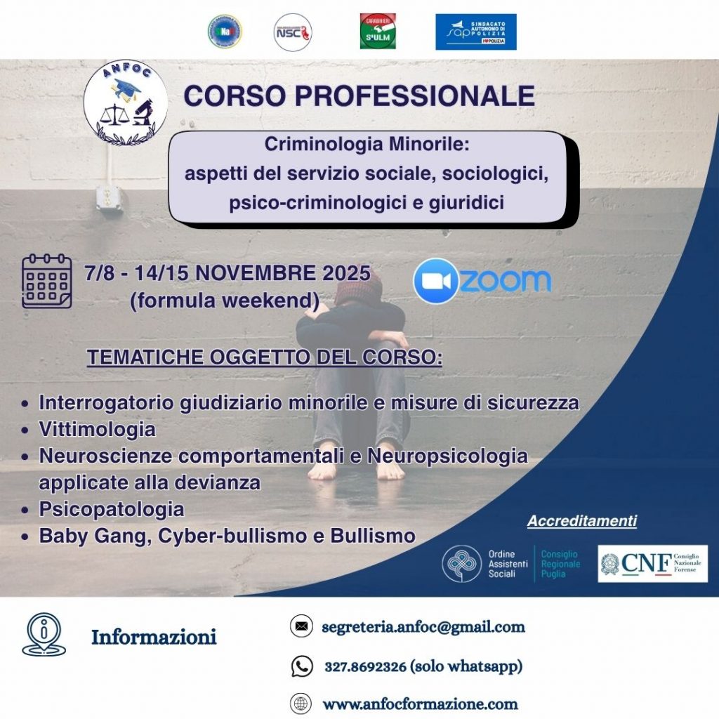 ID 106024 ANFOC associazione nazionale formatori, criminologi e criminalisti – Webinar “Corso Professionale sulla Criminologia dei Minori”, su piattaforma Zoom, n° 17 crediti formativi e n° 5 crediti deontologici