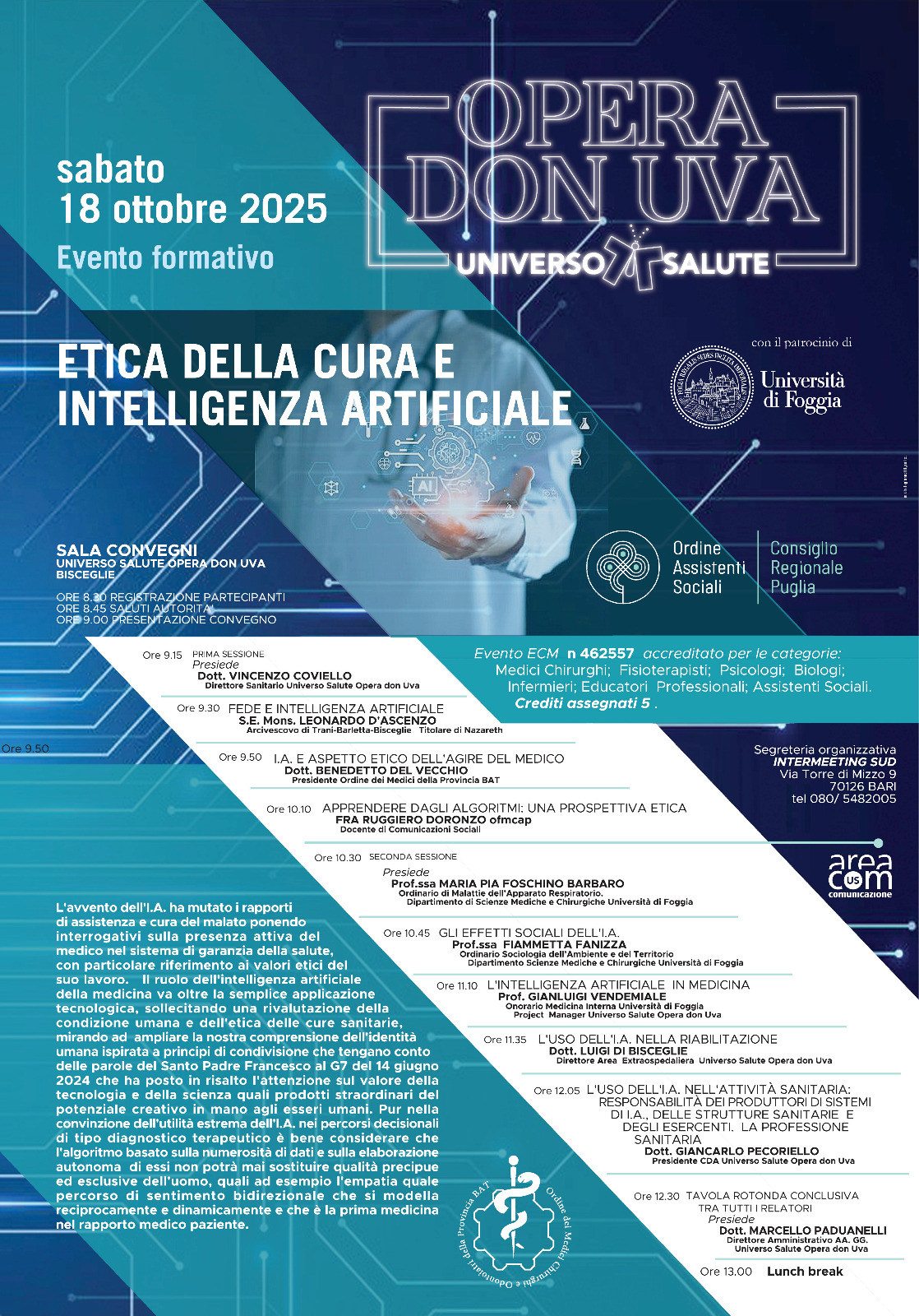 ID 105951 Opera Don Uva – Convegno “Etica della cura e intelligenza artificiale”, 18 ottobre Bisceglie, n° 4 crediti formativi