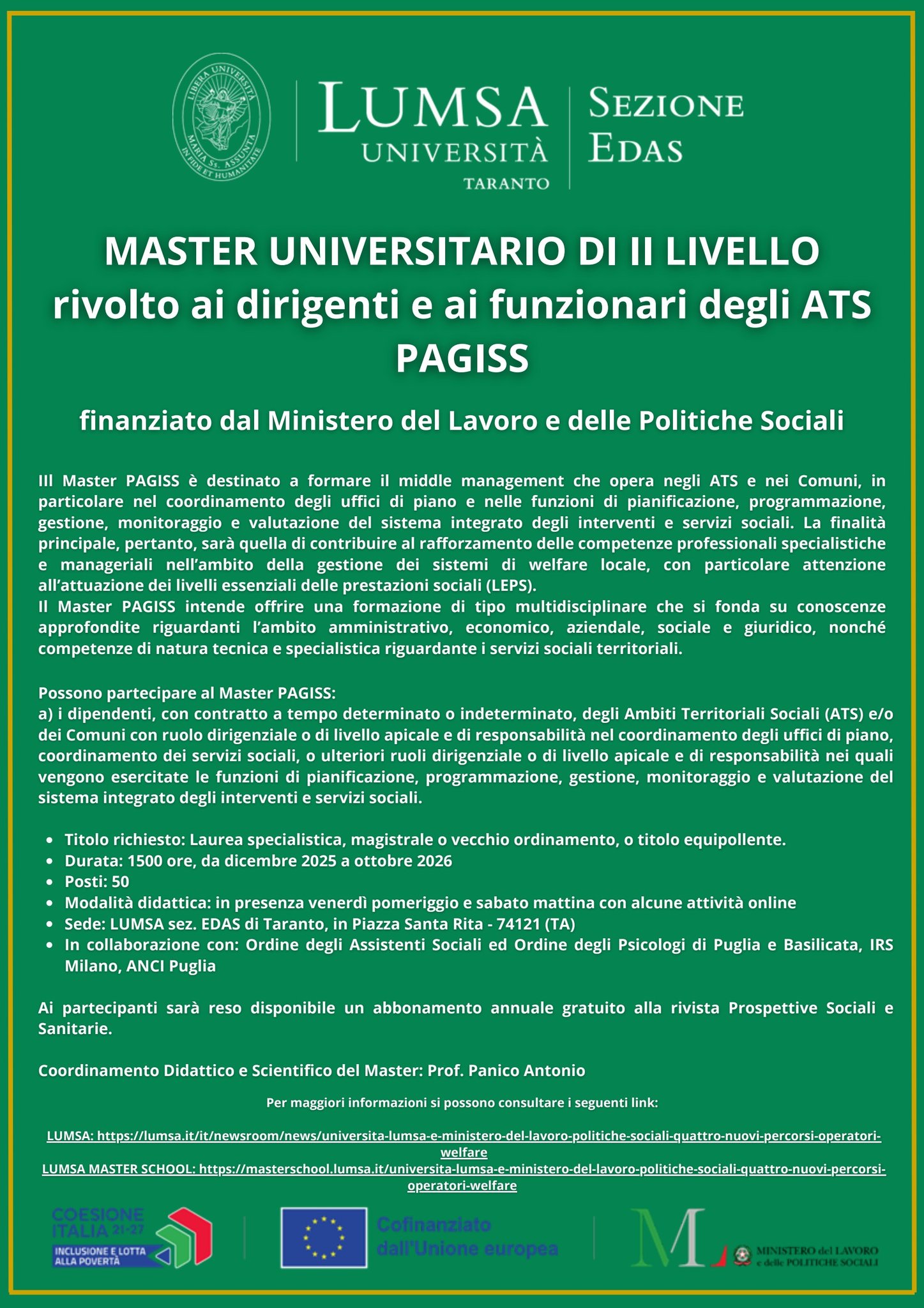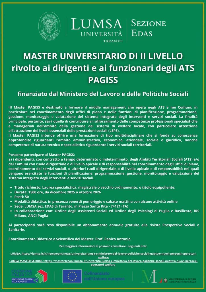 Lunedì 17 novembre alle ore 16:30 presso la sede della LUMSA di Taranto si terrà la presentazione dei Master di I e II livello finanziati dal Ministero del Lavoro e delle Politiche Sociali, a cui parteciperà il presidente Massimiliano Fiorentino.