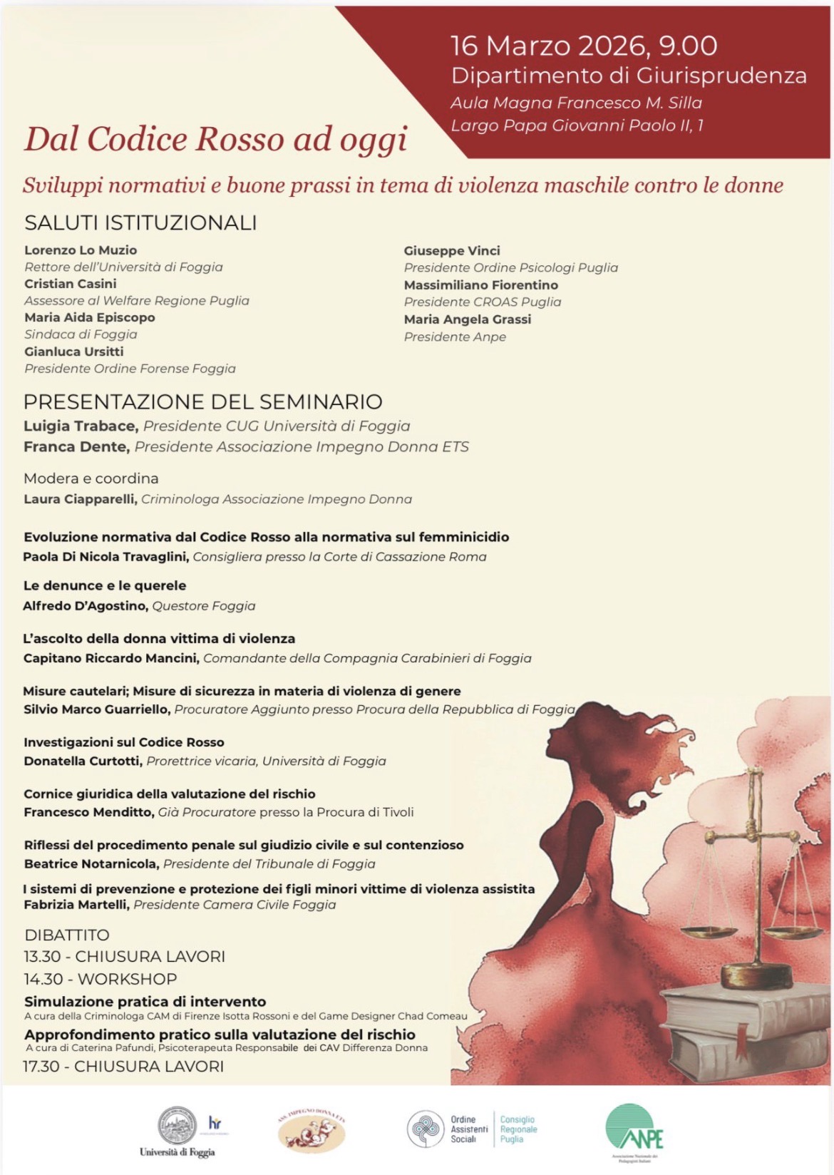 ID 107881 Associazione Impegno donna – Seminario “Dal codice rosso ad oggi:sviluppi normativi e buone prassi”, 16 aprile 2026 presso Università di Foggia, n° 5 crediti formativi e n° 2 crediti deontologici.