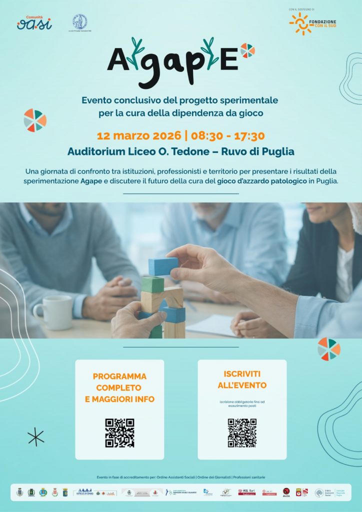 ID 107925 Comunità Oasi 2 San Francesco – Convegno “Agape. Progetto sperimentale per la cura della dipendenza da gioco” 12 marzo 2026 Ruvo Di Puglia, n° 4 crediti formativi e n° 2 crediti deontologici.