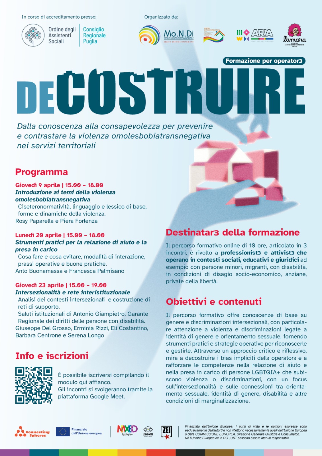 ID 108484 Arci Mixed Aps – Webinar “De-costruire – dalla conoscenza alla consapevolezza per prevenire e contrastare la violenza omolesbobiatransnegativa nei servizi territoriali”, 9 aprile 2026 online, n° 6 crediti formativi e n° 4 crediti deontologici.