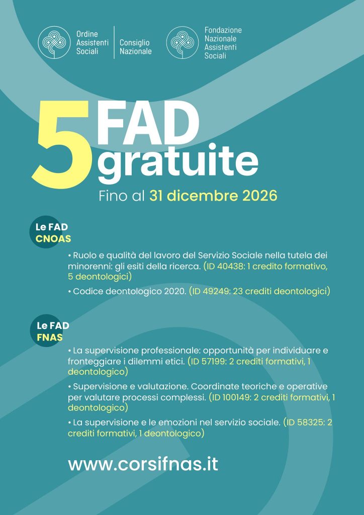 Su www.corsifnas.it sono nuovamente disponibili per ogni assistente sociale, da oggi fino al 31 dicembre 2026, queste FAD gratuite CNOAS – Consiglio Nazionale Ordine Assistenti Sociali e Fnas che, se non già frequentate in passato, permettono di aggiungere crediti al proprio bagaglio formativo per il triennio 2026-2028.