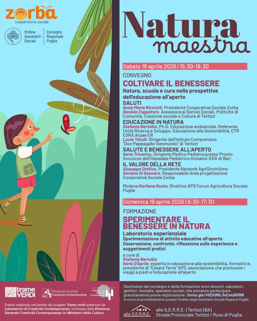 ID 109093 Zorba Cooperativa Sociale, 18 aprile Terlizzi, Convegno “Coltivare il benessere – natura, scuola e cura nella prospettiva dell’educazione all’aperto”, 3 crediti formativi