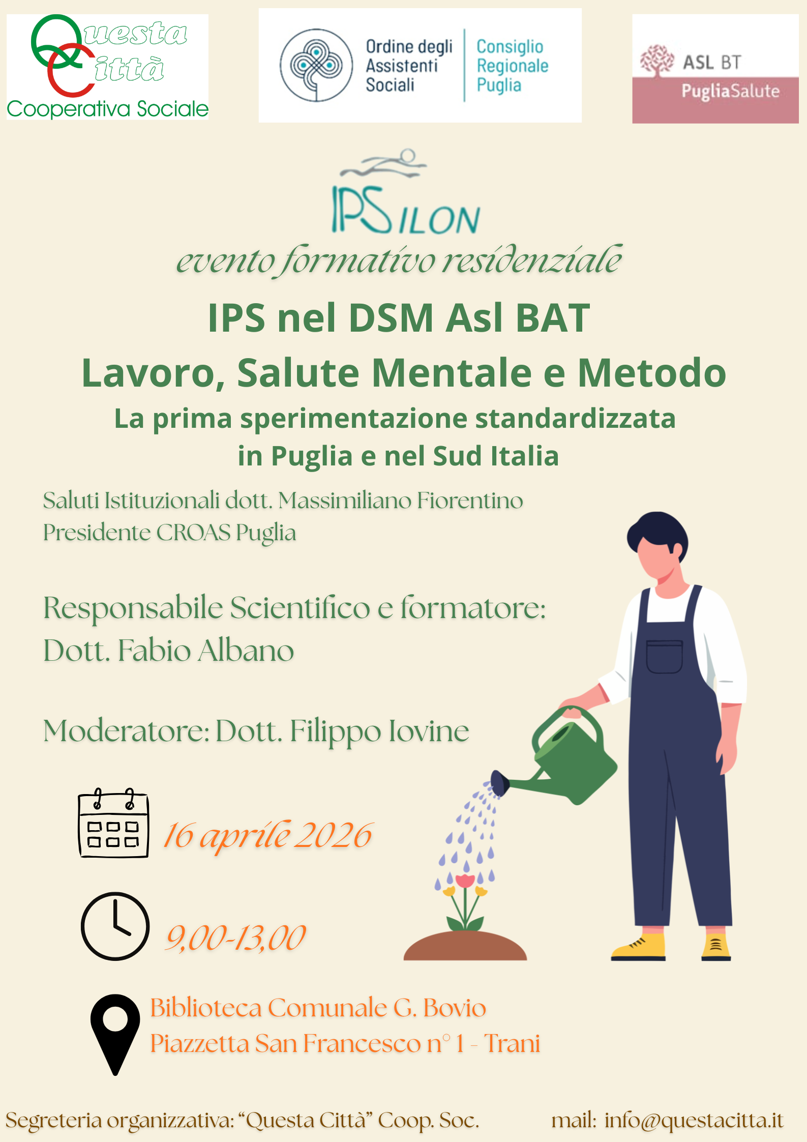 ID 109128 Cooperativa sociale Questa città, 16 aprile Trani, Convegno “Il metodo IPS (Individual Placement and Support) Training per specialisti dell’impiego IPS e operatori del territorio”, 3 crediti formativi