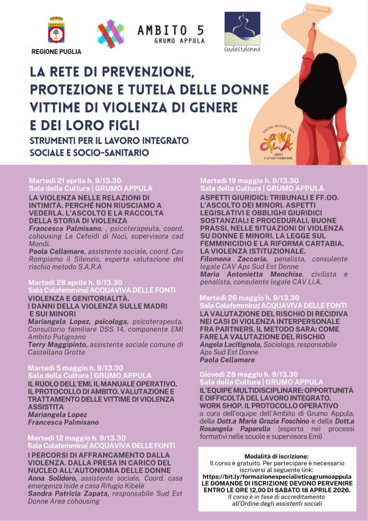 ID 109176 Sud Est Donna, a partire dal 21 aprile Grumo Appula e Acquaviva delle Fonti, Corso “la rete di prevenzione, protezione e tutela delle donne vittime di violenza di genere e dei loro figli”, 21 crediti formativi e 10 crediti deontologici